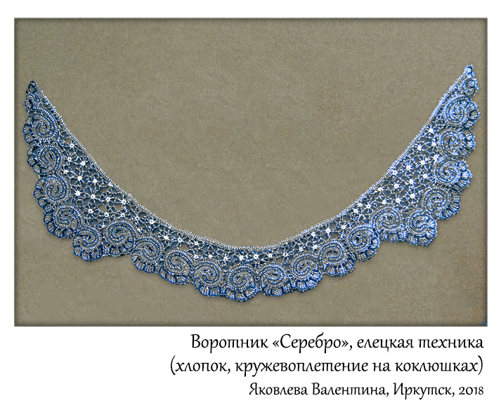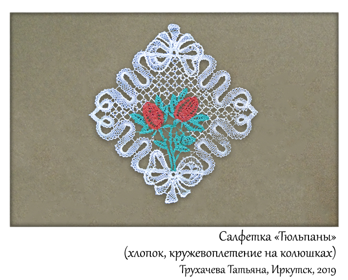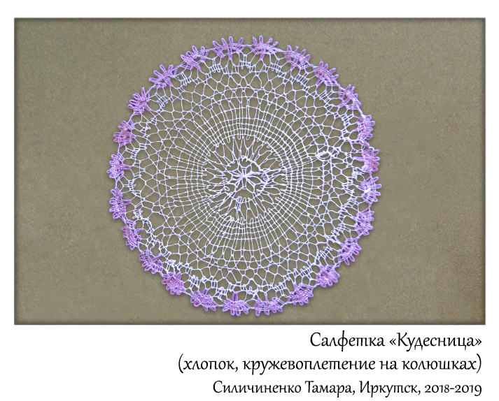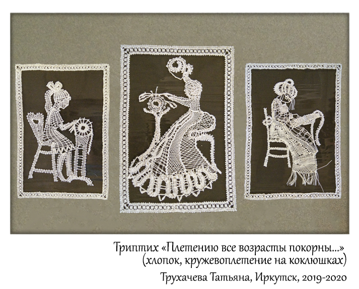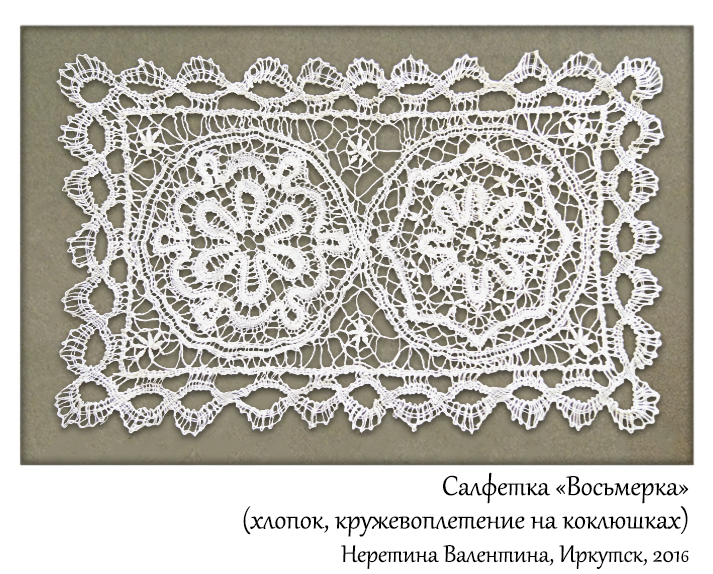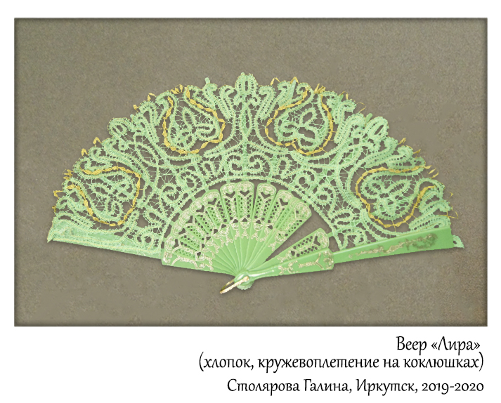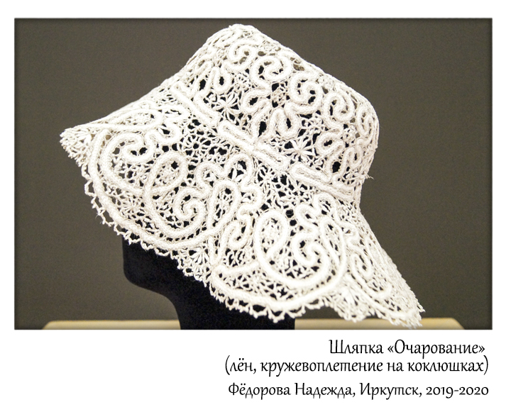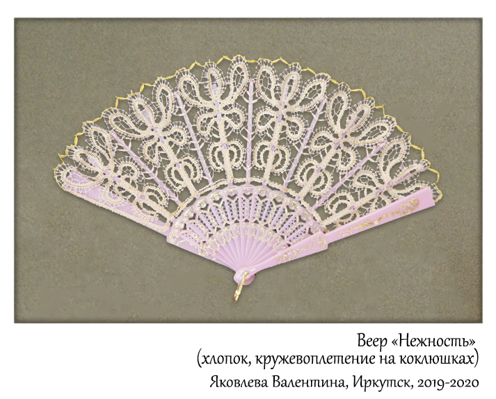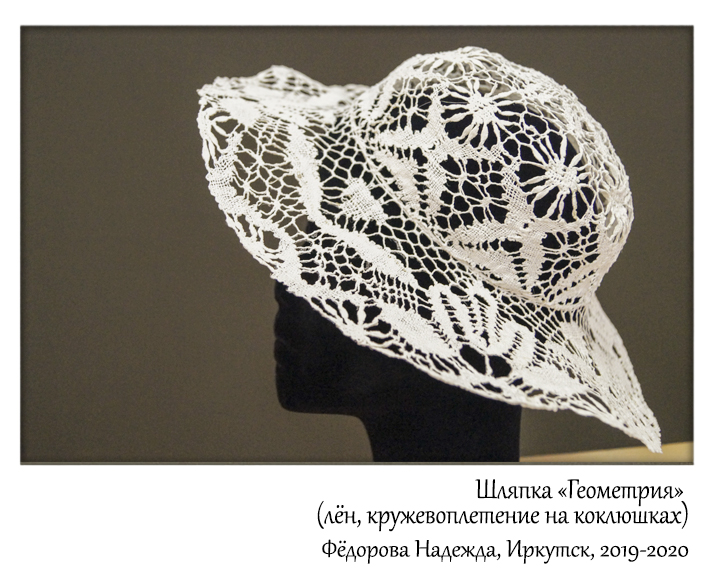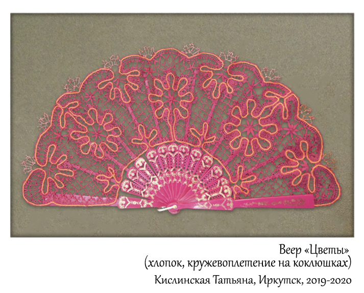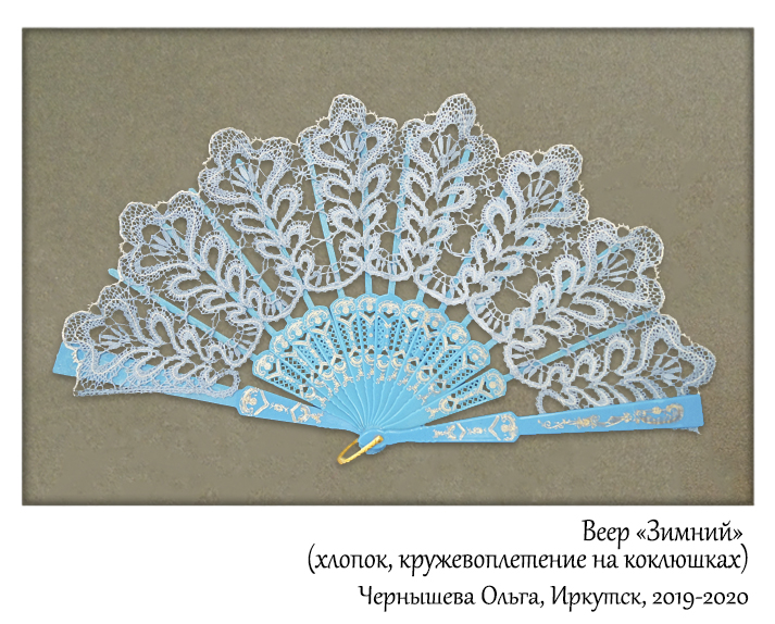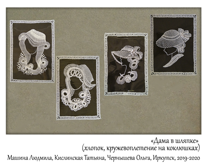 «Кружевом увлеклась еще в конце семидесятых, когда жила в Ангарске. Моя мама в то время занималась у преподавателя по кружеву. Переехав в Иркутск, я начала посещать уроки рукоделия Клавдии Петровны Федоровой. От всего сердца я благодарна моей наставнице за то, что я чего-то достигла в кружевоплетении. Я начала учиться у неё в ДК им. Гагарина, являясь активным членом женского клуба «Хозяюшка». И каковы же хитросплетения судьбы! Сейчас, уже на протяжении 8 лет я учу ветеранов Иркутского авиазавода в этом же ДК. Здесь у меня занимаются «девочки» от 55 до 84 лет. Это мой дорогой клуб «Родник». Они достигли очень хороших результатов. Это видно в экспонатах выставки: веера, женские профили – это их рук работы. После ухода из жизни Клавдии Петровны я подхватила работу в мастерской кружевоплетения ИРООО «Союз мастеров народного искусства “Оникс”», которой руковожу до сего времени. Здесь у меня одни таланты! Посмотрите на эти композиции: «Весна» – работа Федоровой Надежды Ивановны. Очень тонкое французское кружево в технике торшон, выполнена на 54 парах коклюшек, а какие у неё шляпы! А умница-красавица Козлова Мария и её нежнейшая композиция «Зима», авторские работы от создания сколка до воплощения мечты в реальность – её браслеты! А сколько ещё у неё задумок – создать креативный воротник, колье, в котором показать свое любимое животное – волка! И я верю, что это случится.