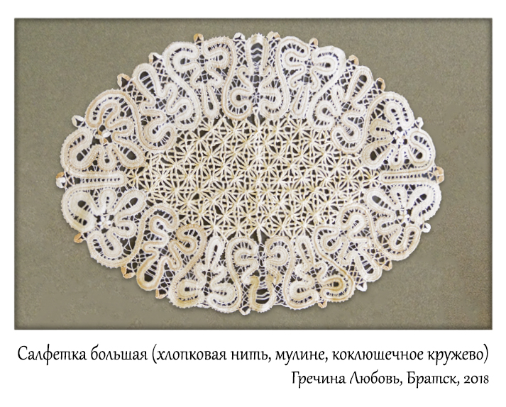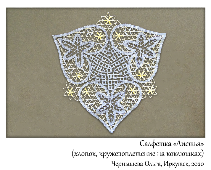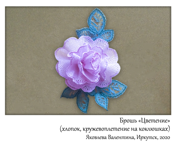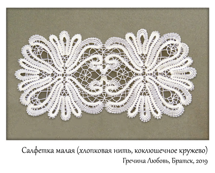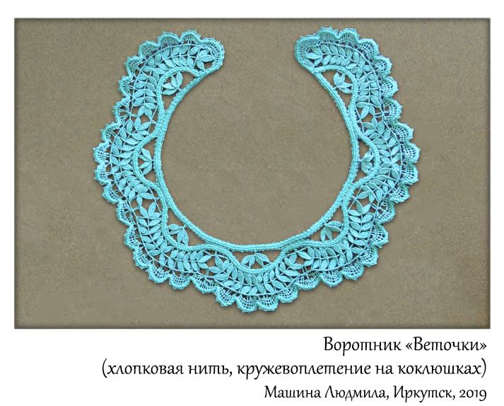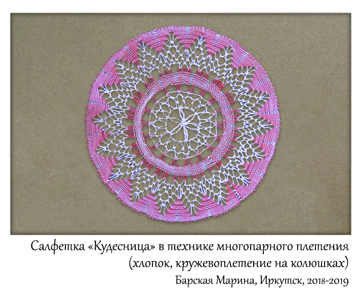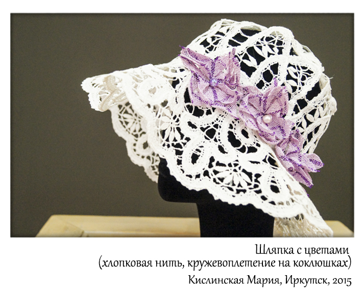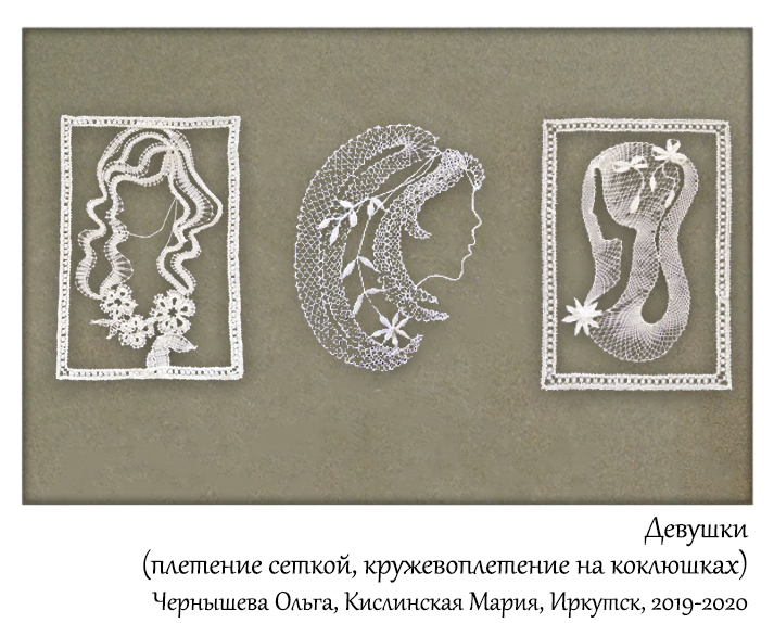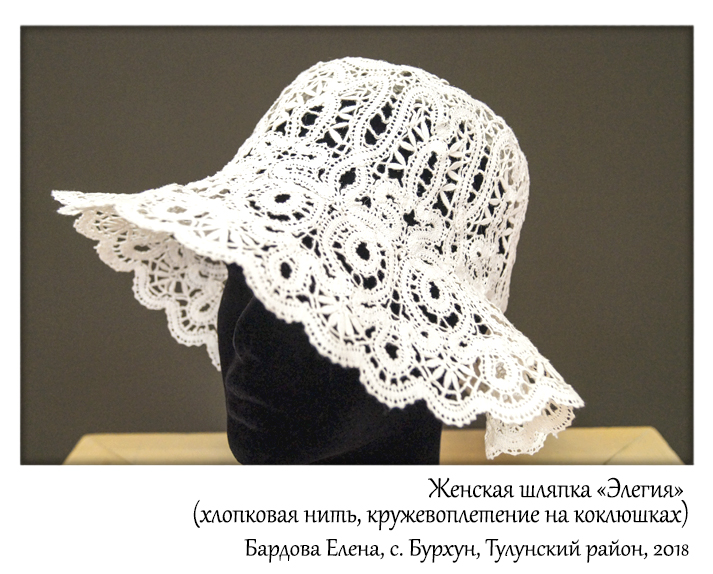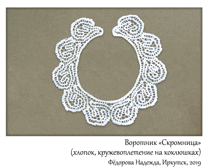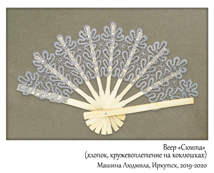 «Кружевом увлеклась еще в конце семидесятых, когда жила в Ангарске. Моя мама в то время занималась у преподавателя по кружеву. Переехав в Иркутск, я начала посещать уроки рукоделия Клавдии Петровны Федоровой. От всего сердца я благодарна моей наставнице за то, что я чего-то достигла в кружевоплетении. Я начала учиться у неё в ДК им. Гагарина, являясь активным членом женского клуба «Хозяюшка». И каковы же хитросплетения судьбы! Сейчас, уже на протяжении 8 лет я учу ветеранов Иркутского авиазавода в этом же ДК. Здесь у меня занимаются «девочки» от 55 до 84 лет. Это мой дорогой клуб «Родник». Они достигли очень хороших результатов. Это видно в экспонатах выставки: веера, женские профили – это их рук работы. После ухода из жизни Клавдии Петровны я подхватила работу в мастерской кружевоплетения ИРООО «Союз мастеров народного искусства “Оникс”», которой руковожу до сего времени. Здесь у меня одни таланты! Посмотрите на эти композиции: «Весна» – работа Федоровой Надежды Ивановны. Очень тонкое французское кружево в технике торшон, выполнена на 54 парах коклюшек, а какие у неё шляпы! А умница-красавица Козлова Мария и её нежнейшая композиция «Зима», авторские работы от создания сколка до воплощения мечты в реальность – её браслеты! А сколько ещё у неё задумок – создать креативный воротник, колье, в котором показать свое любимое животное – волка! И я верю, что это случится.