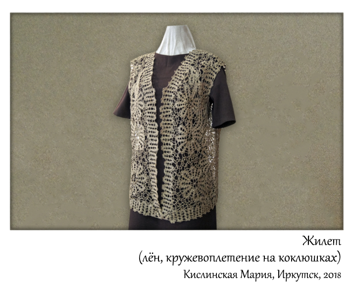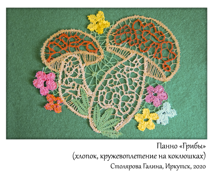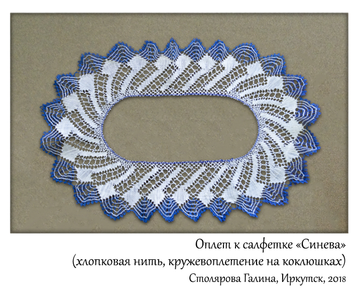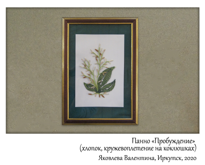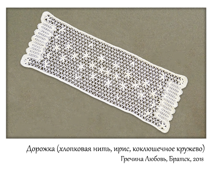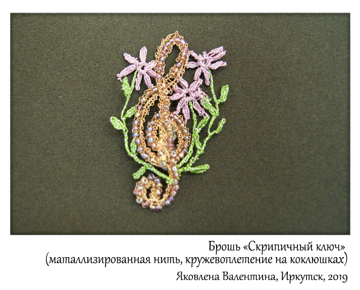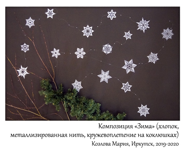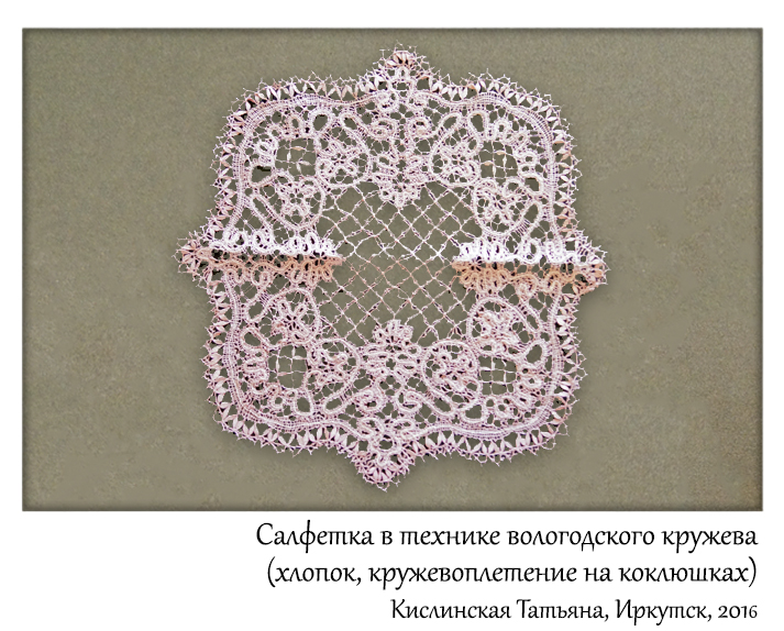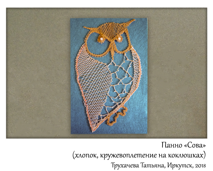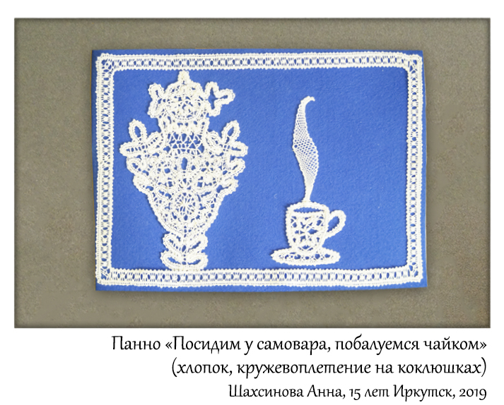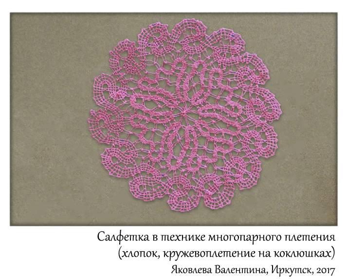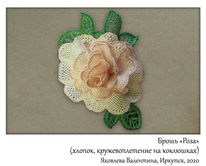 «Кружевом увлеклась еще в конце семидесятых, когда жила в Ангарске. Моя мама в то время занималась у преподавателя по кружеву. Переехав в Иркутск, я начала посещать уроки рукоделия Клавдии Петровны Федоровой. От всего сердца я благодарна моей наставнице за то, что я чего-то достигла в кружевоплетении. Я начала учиться у неё в ДК им. Гагарина, являясь активным членом женского клуба «Хозяюшка». И каковы же хитросплетения судьбы! Сейчас, уже на протяжении 8 лет я учу ветеранов Иркутского авиазавода в этом же ДК. Здесь у меня занимаются «девочки» от 55 до 84 лет. Это мой дорогой клуб «Родник». Они достигли очень хороших результатов. Это видно в экспонатах выставки: веера, женские профили – это их рук работы. После ухода из жизни Клавдии Петровны я подхватила работу в мастерской кружевоплетения ИРООО «Союз мастеров народного искусства “Оникс”», которой руковожу до сего времени. Здесь у меня одни таланты! Посмотрите на эти композиции: «Весна» – работа Федоровой Надежды Ивановны. Очень тонкое французское кружево в технике торшон, выполнена на 54 парах коклюшек, а какие у неё шляпы! А умница-красавица Козлова Мария и её нежнейшая композиция «Зима», авторские работы от создания сколка до воплощения мечты в реальность – её браслеты! А сколько ещё у неё задумок – создать креативный воротник, колье, в котором показать свое любимое животное – волка! И я верю, что это случится.