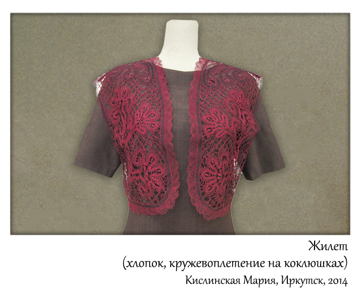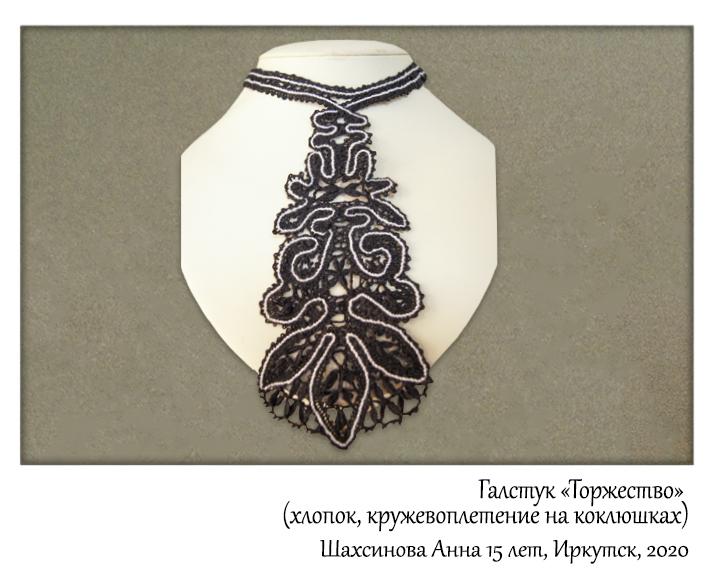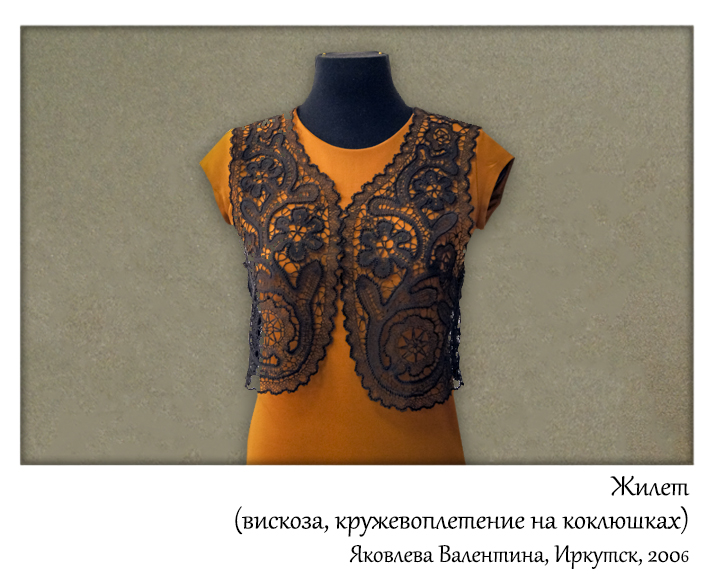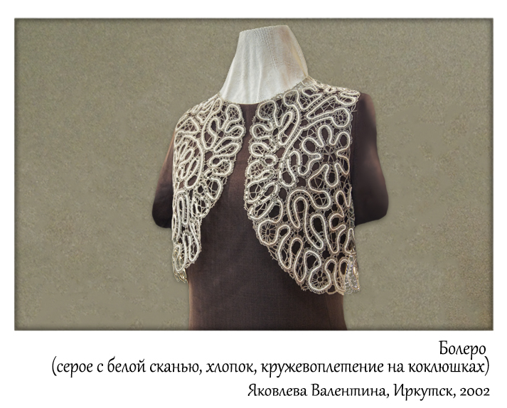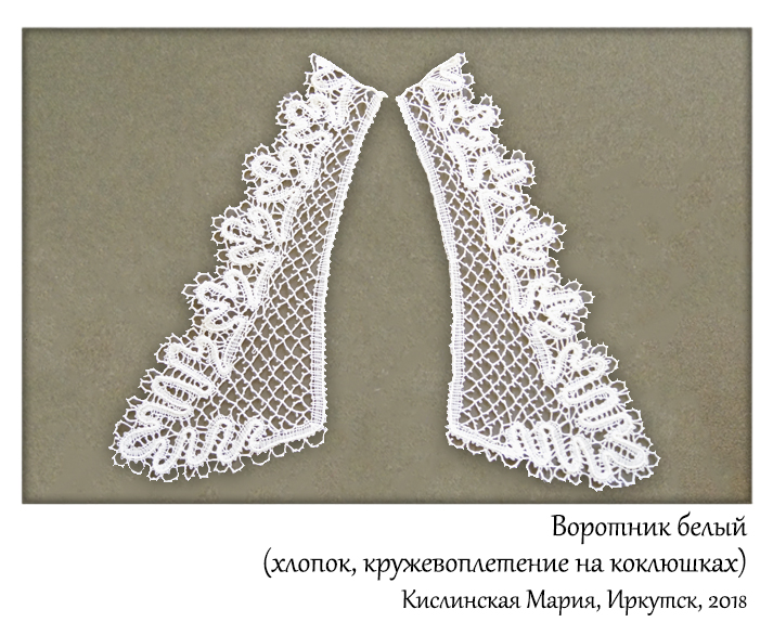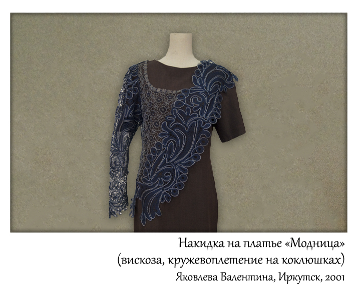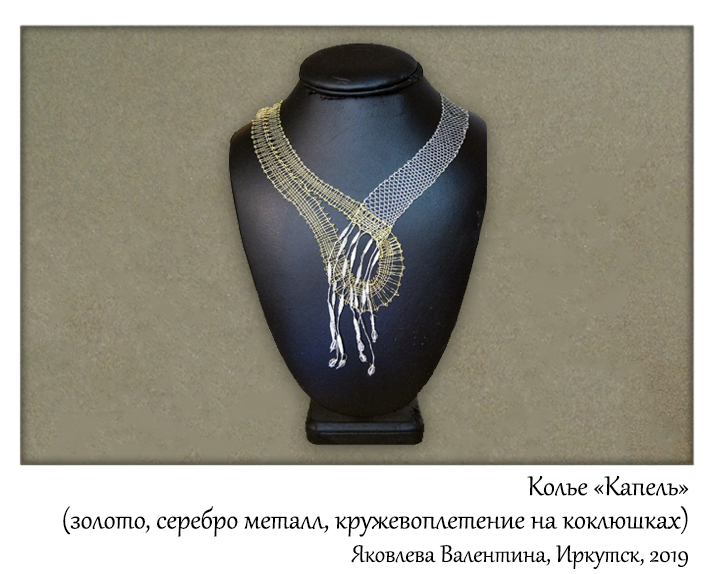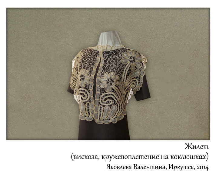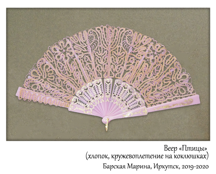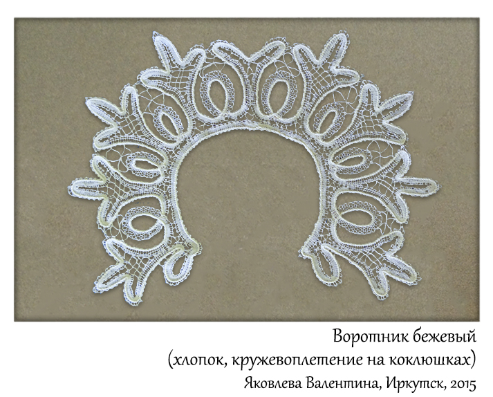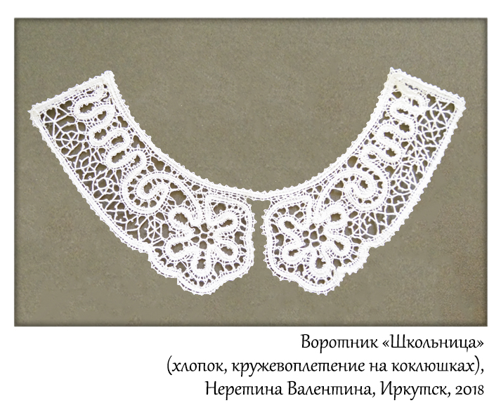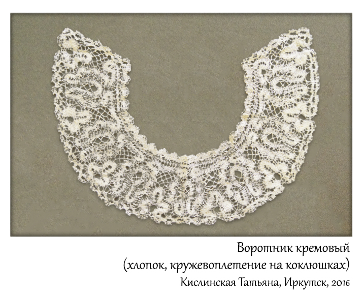 Основное ядро выставки составляют работы иркутянки Валентины Яковлевой и ее учениц. Валентина Ивановна много лет посвятила изучению традиций кружевоплетения и, хотя сама уже давно преподает это ремесло, продолжает углублять свои знания. Она не боится экспериментировать и прививает этот подход ученицам. Так им удается не только по-новому интерпретировать классику, находя для нее современные решения (наглядный пример – кружевные веера, основной модный аксессуар XVIII-XIX вв., в который мастерицам удалось заново вдохнуть жизнь). Они также открывают и новые, ранее не распространенные формы: кружевные галстуки, броши, декоративные панно; сочетают кружевоплетение с другими техниками и материалами: вышивкой, бисером.