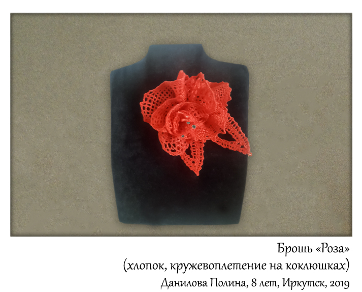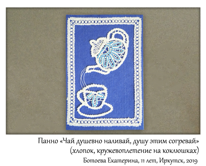 Пять лет я преподавала в Центре детского творчества «Восход» сразу по трём направлениям: работа с бисером, ручное ткачество и моё самое любимое – кружевоплетение. Ушла на пенсию и не думала возвращаться в школу. И опять крутой поворот судьбы – я руковожу объединением «Кружевница» школы №69. Здесь, не могу сказать «каждая», потому что у меня есть и три мальчика. В школе я работаю всего второй год. А какие у нас результаты! Данилова Полина и Ермакова Валентина выполнили в прошлом году научную работу и на Всероссийском конкурсе заняли второе место в номинации «Возрождение русских традиций». Работы детей здесь представлены различными панно, предметами одежды. Многие дети являются победителями дистанционных международных конкурсов: Ботоева Екатерина, Данилова Полина и Ермакова Валентина, Шахсинова Анна, Сова Иван. Это говорит о том, что наше кружево продолжает жить и развиваться. И я всячески буду этому содействовать.