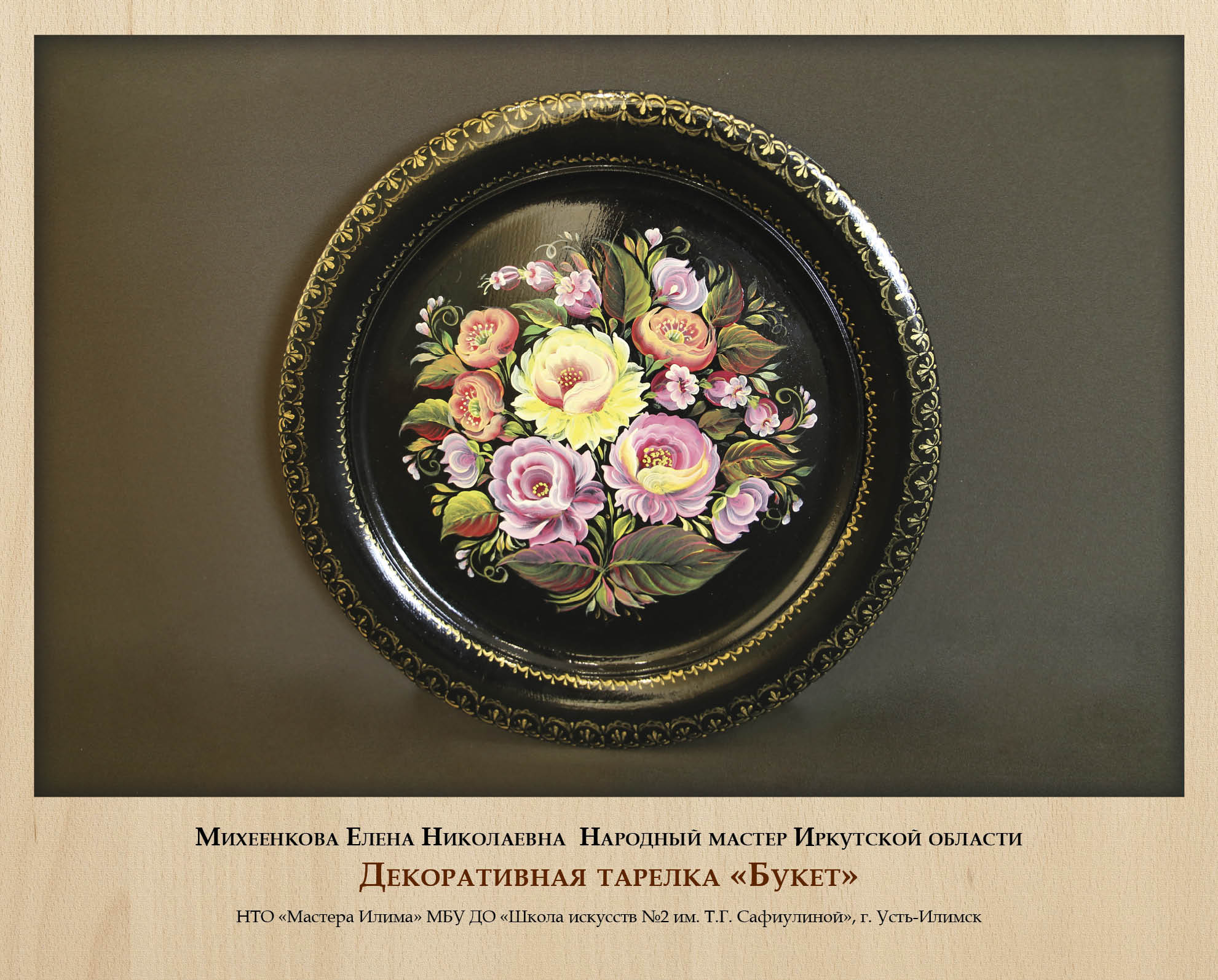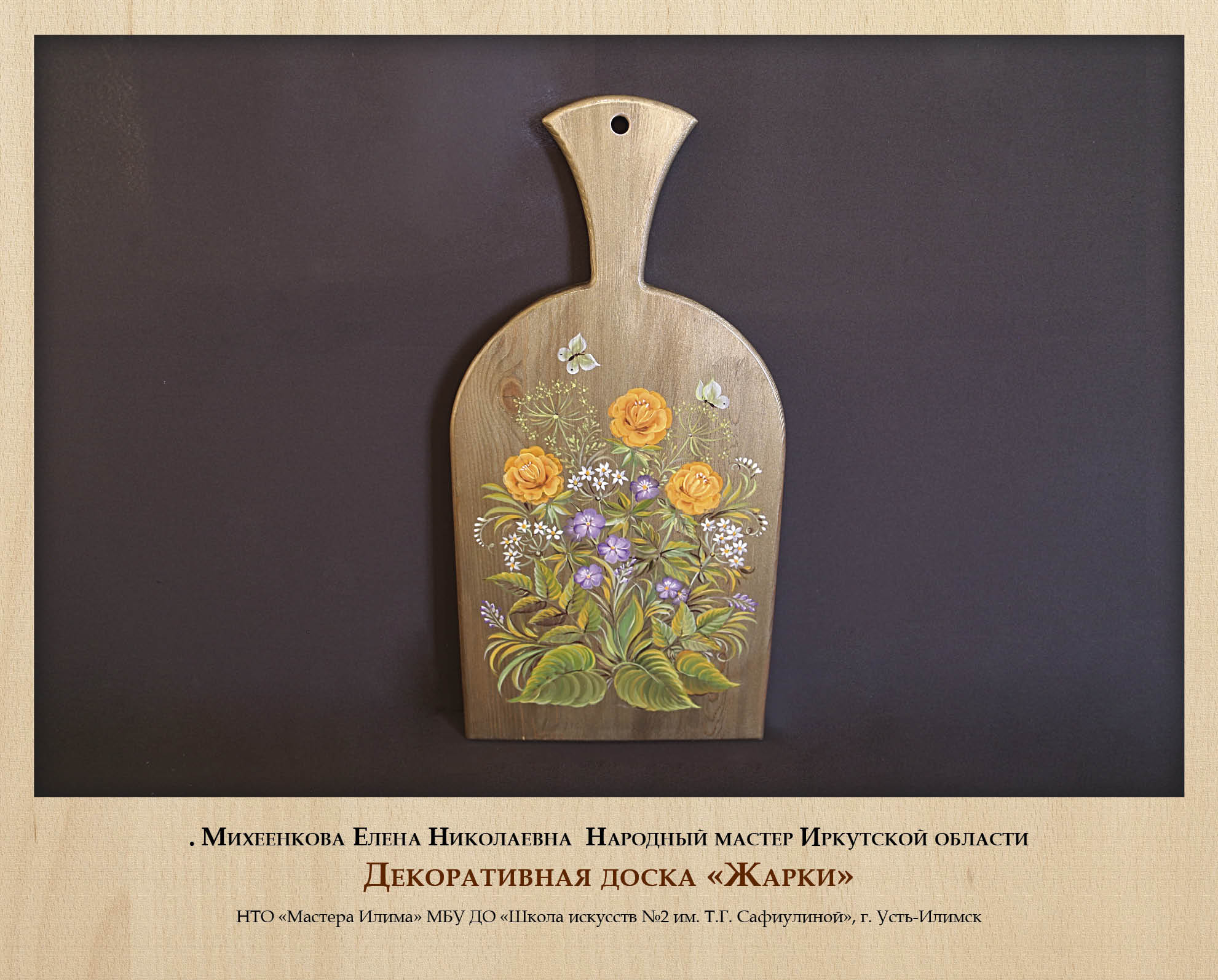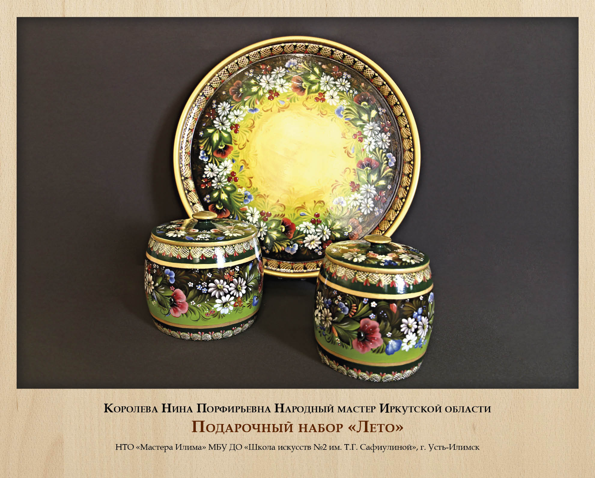 Традиционно многие виды деревянных изделий дополнительно оформлялись росписью, и роспись по дереву также стала самостоятельным ремеслом со своими локальными особенностями. Сильная школа росписи сложилась в г. Усть-Илимске, где мастера не только глубоко и вдумчиво изучают различные исторически известные виды росписи (жостовскую, хохломскую, мезенскую и другие), но и активно экспериментируют, адаптируют их к сибирской тематике и колориту, создают собственные авторские вариации. Выставку украсили работы Народных мастеров Иркутской области Е.Н. Михеенковой и Н.П. Королевой, а также В.С. Бутенко, Е.А. Волк, Н.Г. Зинченко.
