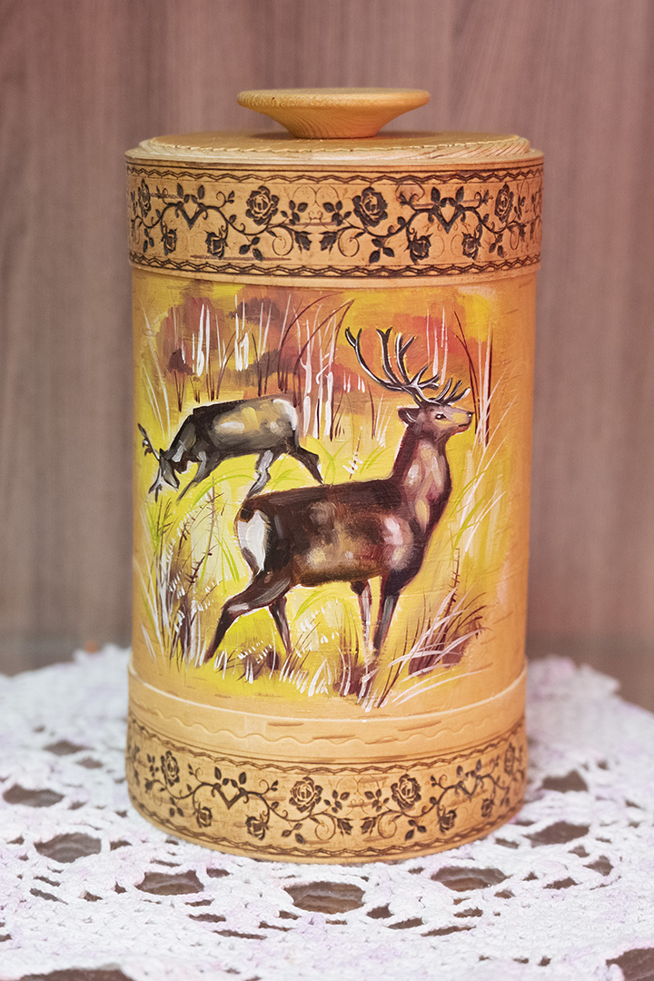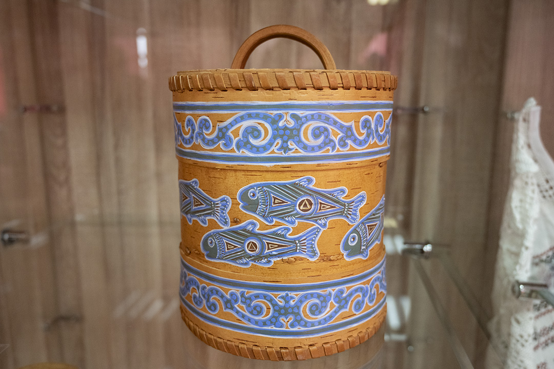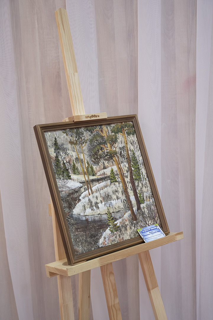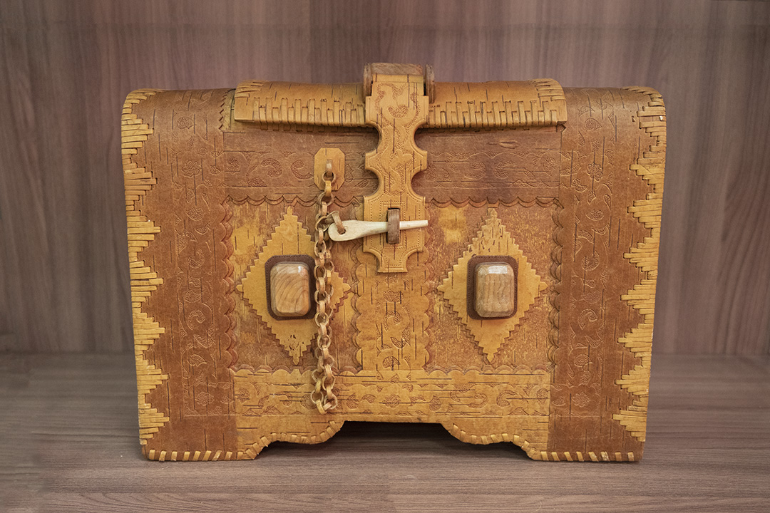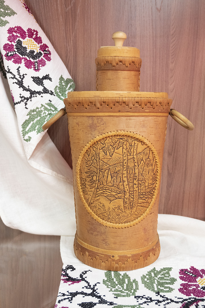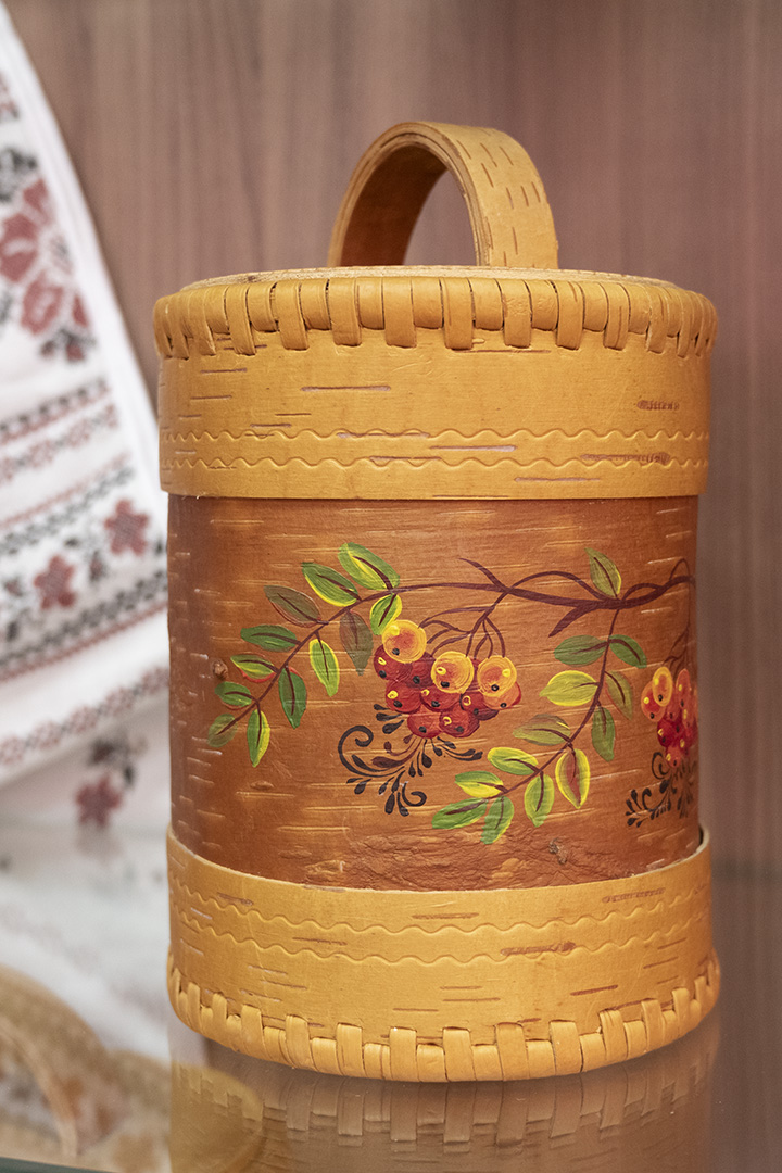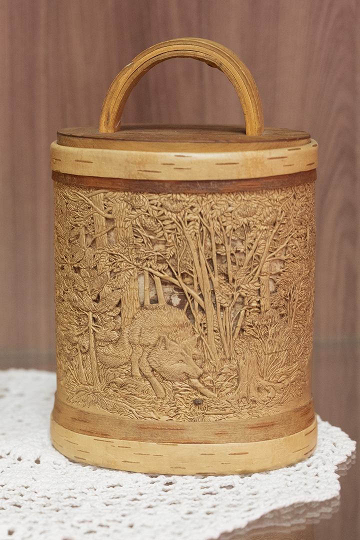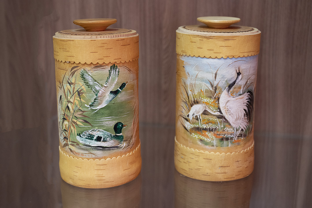 Панно, картины, туеса, сундуки, корзины – всего в экспозиции 36 предметов из бересты. Мастера работали в разных техниках: плетение, прорезная, аппликация, живопись по бересте, многослойная береста, мозаика, вышивка берестяной лентой.