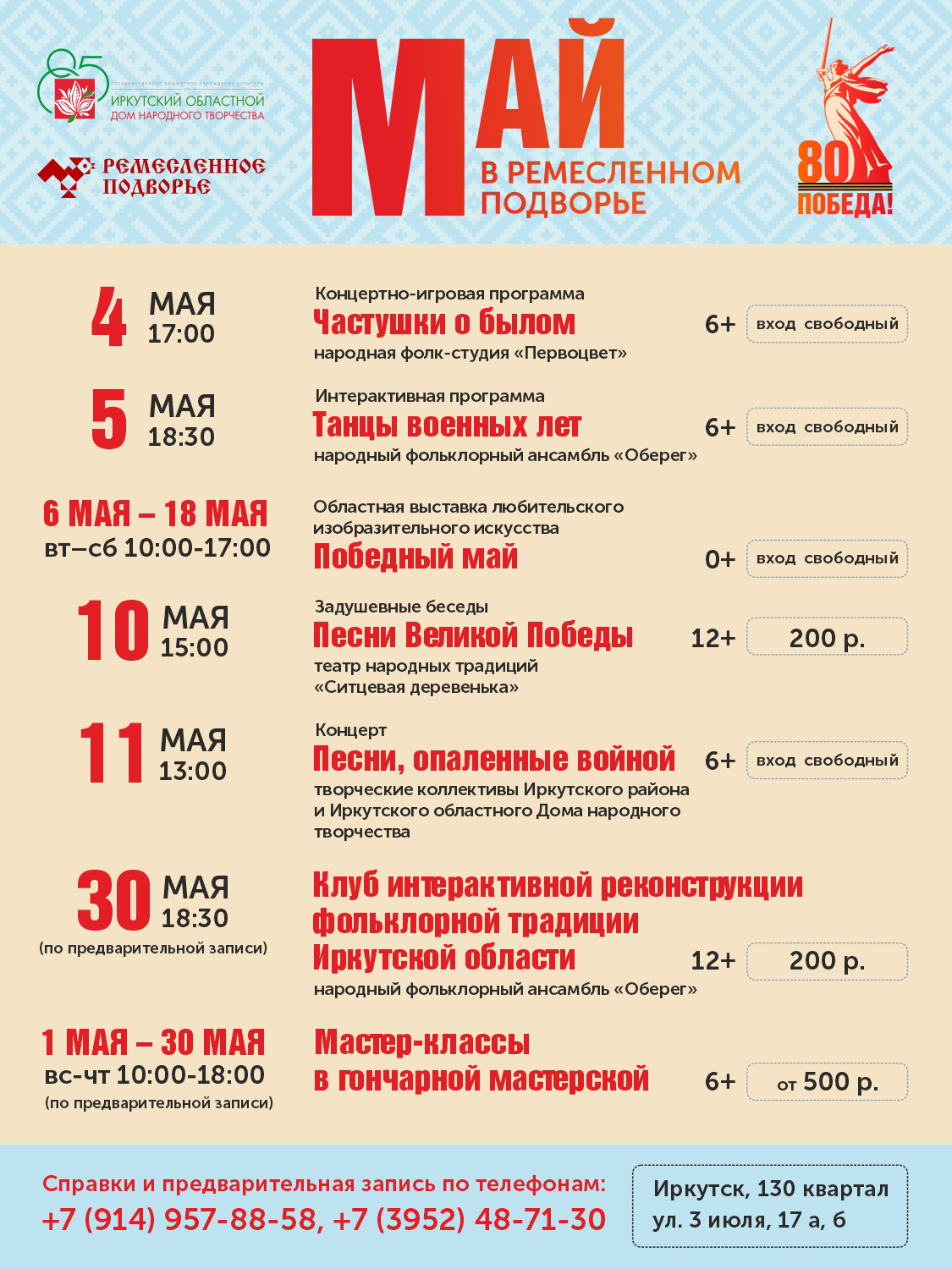 В концерте примут участие коллективы из Алтайского края, Республик Бурятия и Тыва, Омской и Иркутской областей – более 200 артистов. Событие приурочено к 85-летию Иркутского областного Дома народного творчества, 110-летию Государственного Российского Дома народного творчества, 80-летию Великой Победы и завершению Года защитника Отечества в России.