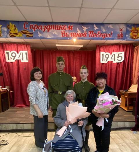 Детям войны, находящимся в зале, и вдове участника специальной военной операции были вручены цветы и подарки. Со сцены звучали трогательные песни в исполнении взрослой вокальной группы «Русская песня»: «Огонек», «Пока плачет Богородица».