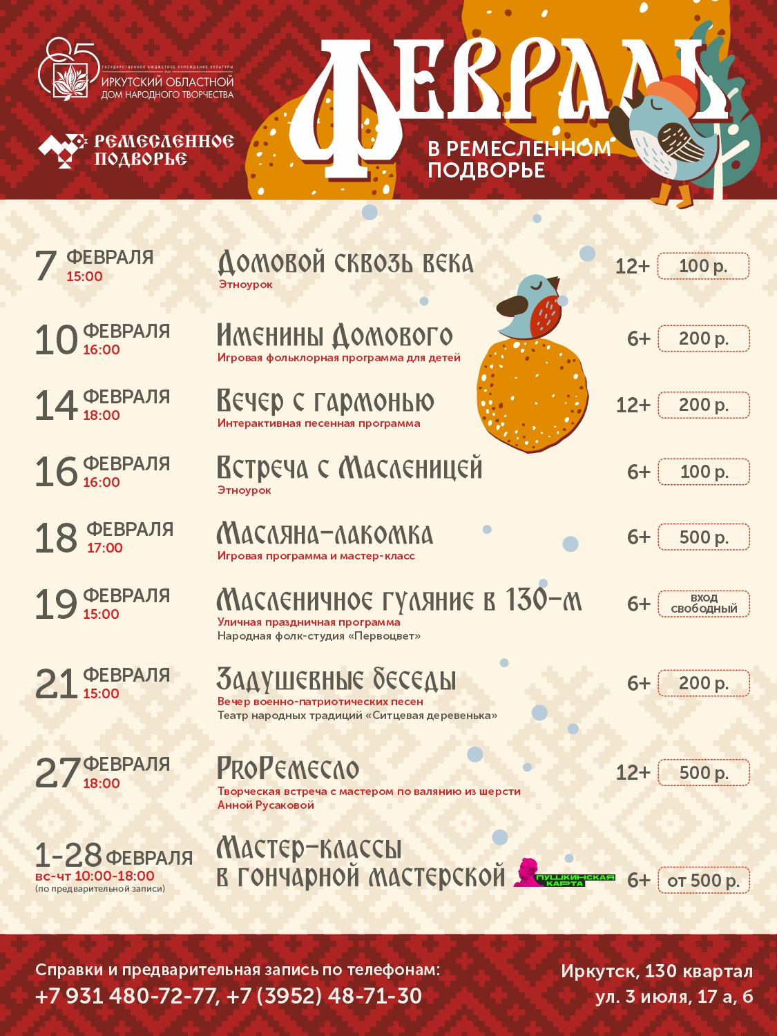 Январские колядки позади, и в Ремесленном подворье уже вовсю готовятся к последнему месяцу зимы. Февральский репертуар проведёт вас от шумных посиделок с хозяйственным Домовым до широкого Масленичного гулянья. Устраивайтесь поудобнее, рассказываем, как будем зиму провожать.