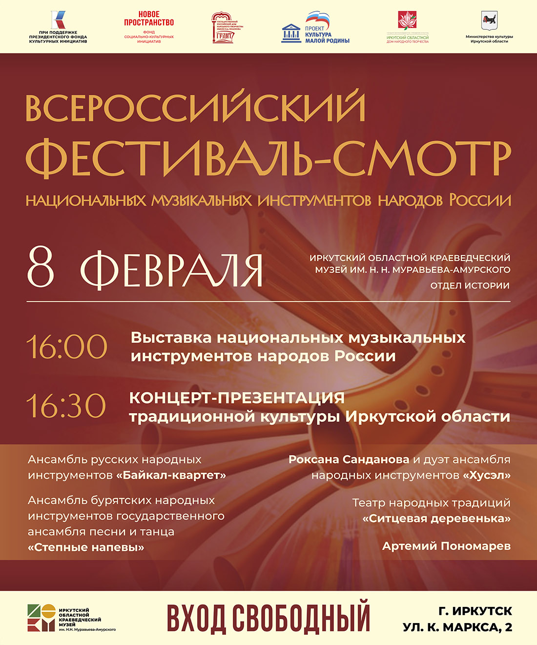 Иркутск – самая восточная точка на карте события. В 2026 году Всероссийский фестиваль-смотр национальных музыкальных инструментов народов России ПРОХОДИТ в четырёх регионах страны: Иркутская область, Республика Карелия, Удмуртская Республика, Ставропольский край – охватывая все федеральные округа страны.