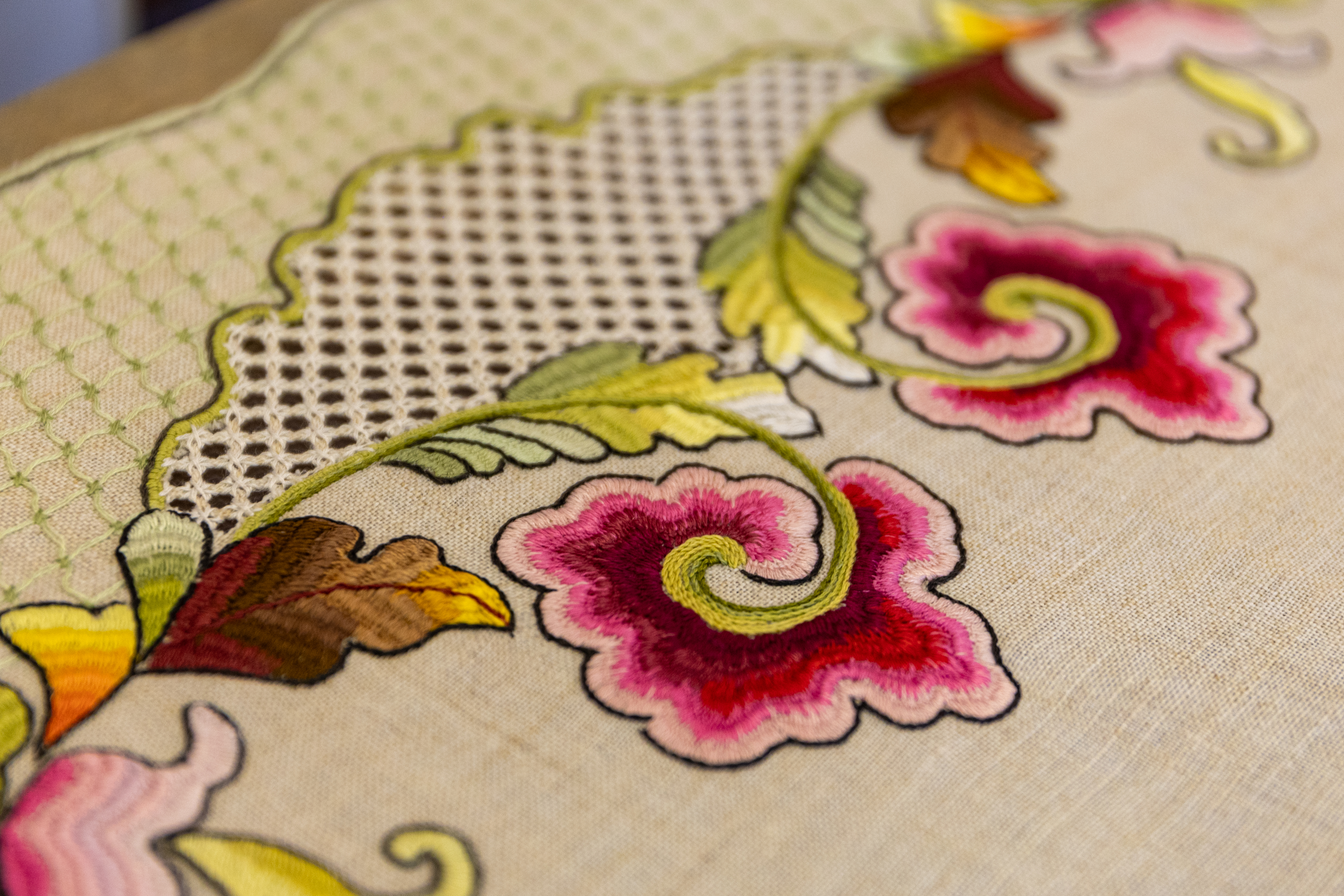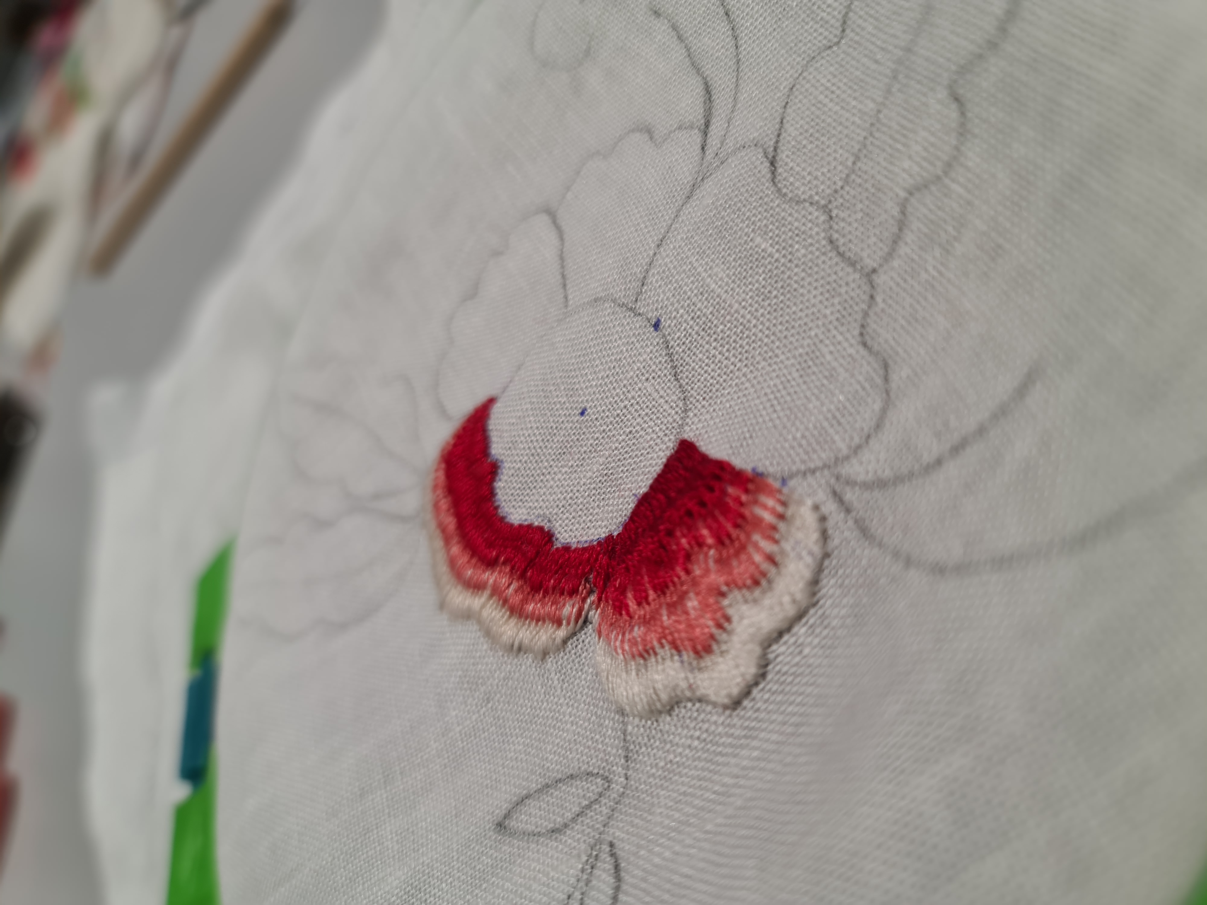 Пример нанесения карандашного контура на ткань с частично выполненным фрагментом вышивки (Щенова В.А., 2024 г.)