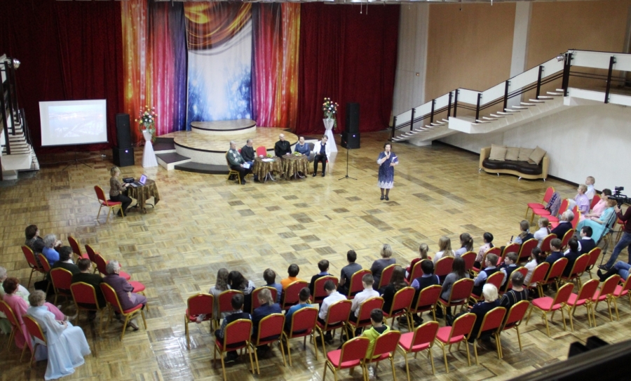 Зал Дворца культуры им. И.И. Наймушина празднично оформлен, на экране демонстрируются старые фотографии о первопроходцах Усть-Илимска и городские зарисовки.