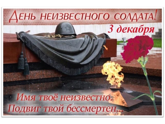 Третье декабря – одна из печальных памятных дат в России – День Неизвестного Солдата. Это дань уважения всем солдатам и офицерам, которые погибли на полях сражений, но навсегда остались безымянными защитниками Отечества.